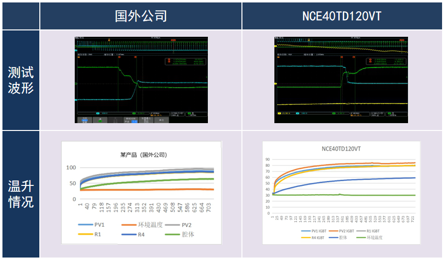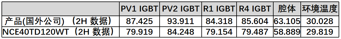 兩款器件在功能測試及波形測試上表現均滿足要求,NCE40TD120VT在boost部分溫升較I產品(i公司)低9.454℃,逆變部分低5.908℃。因而溫升表現上,NCE40TD120VT更有優勢。
